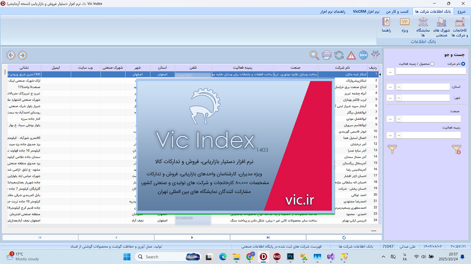 نرم افزار Vic Index یک نرم افزار مدیریت ارتباط با مشتریان کوچک و سبک است به همراه بانک اطلاعات شرکت ها و کارخانجات ایران و فهرست شرکت کنندگان در نمایشگاه های بین المللی تهران می باشد.